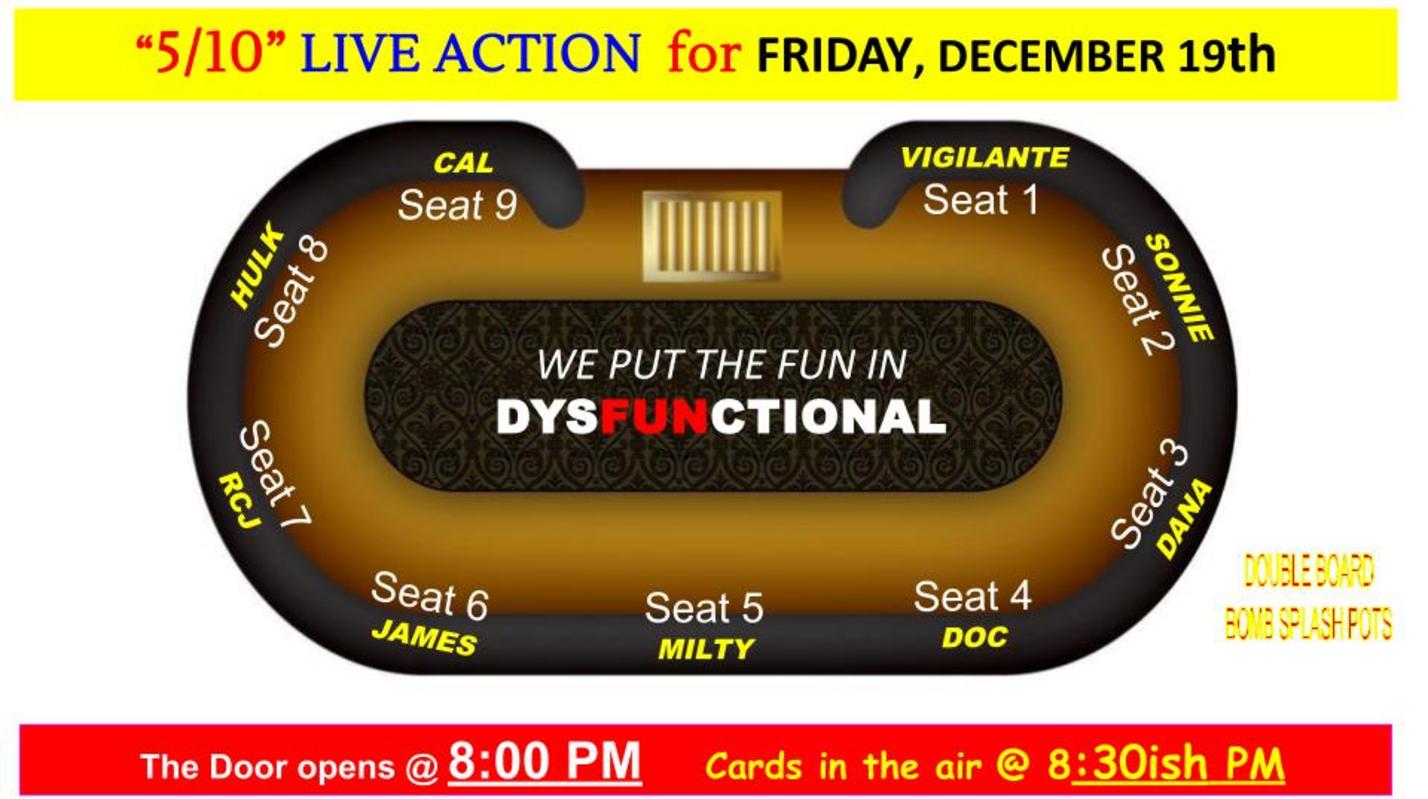 To reserve an open seat, simply use one of the 3 available e-pay options above to send your deposit and seat # assignment in the notes of your preferred payment method. Players who pay the $20 RSVP Deposits to lock seats for Starting Line-up that do not show up within 15 minutes of cards going In The Air will automatically lose seat and forfeit deposit towards Splash Pot and will be rolled to the Waiting List. NO EXCEPTIONS!!!